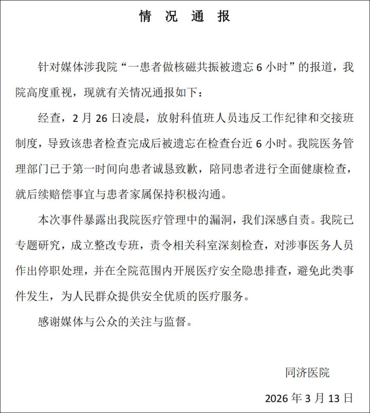 经查,2月26日凌晨,辐射科值班东谈主员违背使命次序和交交班轨制,导致该患者检查完成后被淡忘在检查台近6小时。我院医务处理部门已于第一时间向患者提拔致歉,伴随患者进行全面健康检查,就后续补偿事宜与患者家属保执积极调换。
