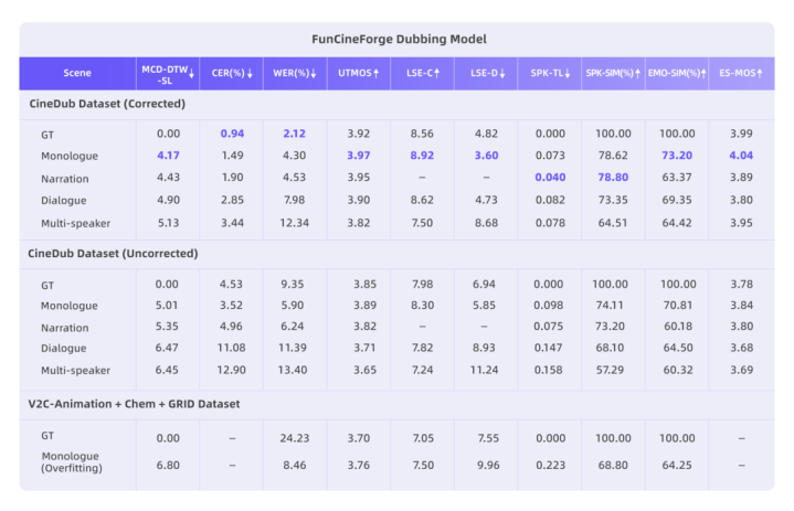 咱们在自建的CineDub数据集上对Fun-CineForge进行了全面评估,笼罩独白、旁白、对话、多东说念主场景等多种典型影视配音场景。收场表现,单东说念主场景成果最优,独白和旁白的中翰墨错率仅1.49%和1.90%,音画同步精确。