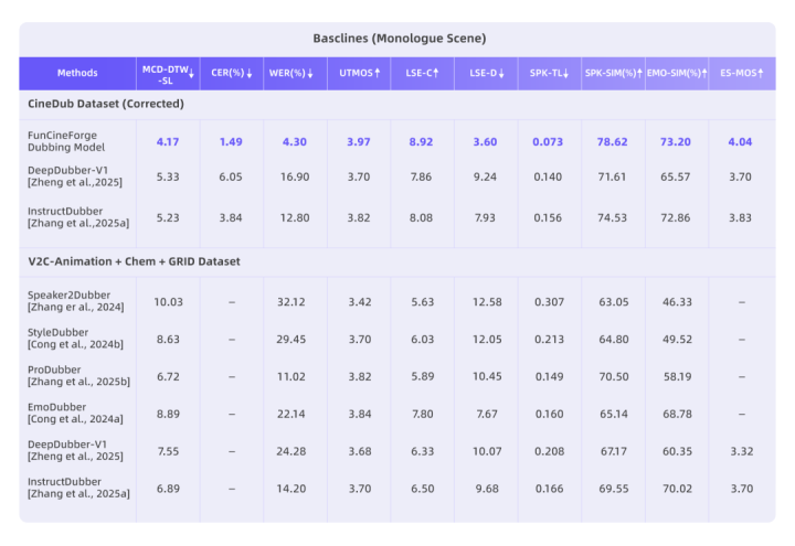 其中,Fun-CineForge配音模子以独白和旁白两种单东说念主配音场景成果最好,初度扶持双东说念主对话与多东说念主对话的场景,并省略杀青准确的期间对皆、音画同步与音色一致。