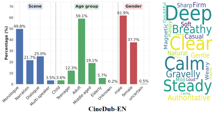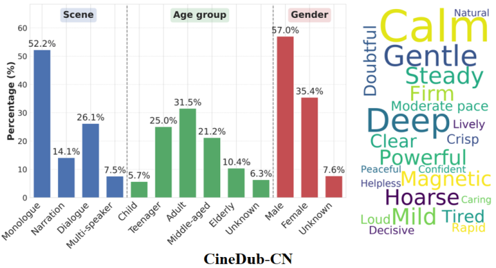 瞩目:从350多部的中英文影视剧中出产的CineDub数据集在场景类别,年事分散,性格分散,音色热词的统计情况。