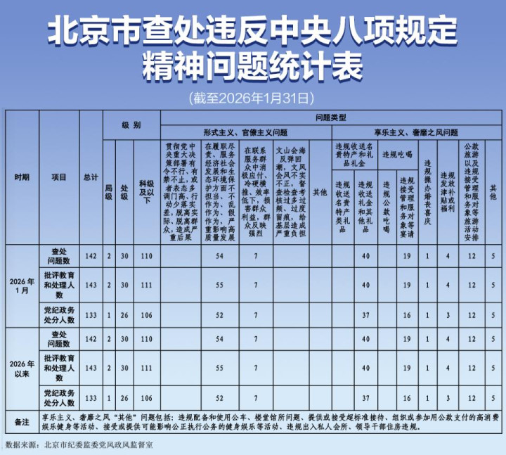 6686 2026年1月北京查处违犯中央八项律例精神问题142起