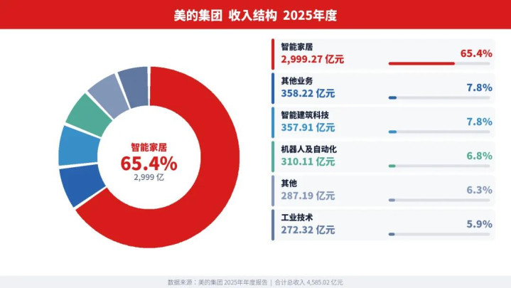 家电依然是中枢,财年收入2999.27亿,占总收入65.4%,其他几伟业务共计是1585.75亿的收入,包括楼宇科技358亿,其他业务358亿,机器东谈主及自动化310亿,立异业务和工业时间差异是287亿和272亿。