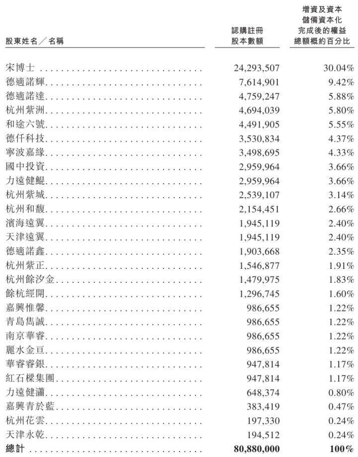 IPO前,宋宁博士共利用42,102,157股股份所附表决权,占表决权约52.06%。其中可通过其个东说念主身份捏有24,293,507股股份,6686体育(6686Sports)占已刊行股本总数约30.04%;德适诺辉捏有7,614,901股股份,占已刊行股本总数约9.42%;德适诺达捏有4,759,247股股份,占已刊行股本总数约5.88%;德仟科技捏有3,530,834股股份,占已刊行股本总数约4.37%;及德适诺鑫捏有1,903,668股股份,占德适生物已刊行股本总数约2.35%。
