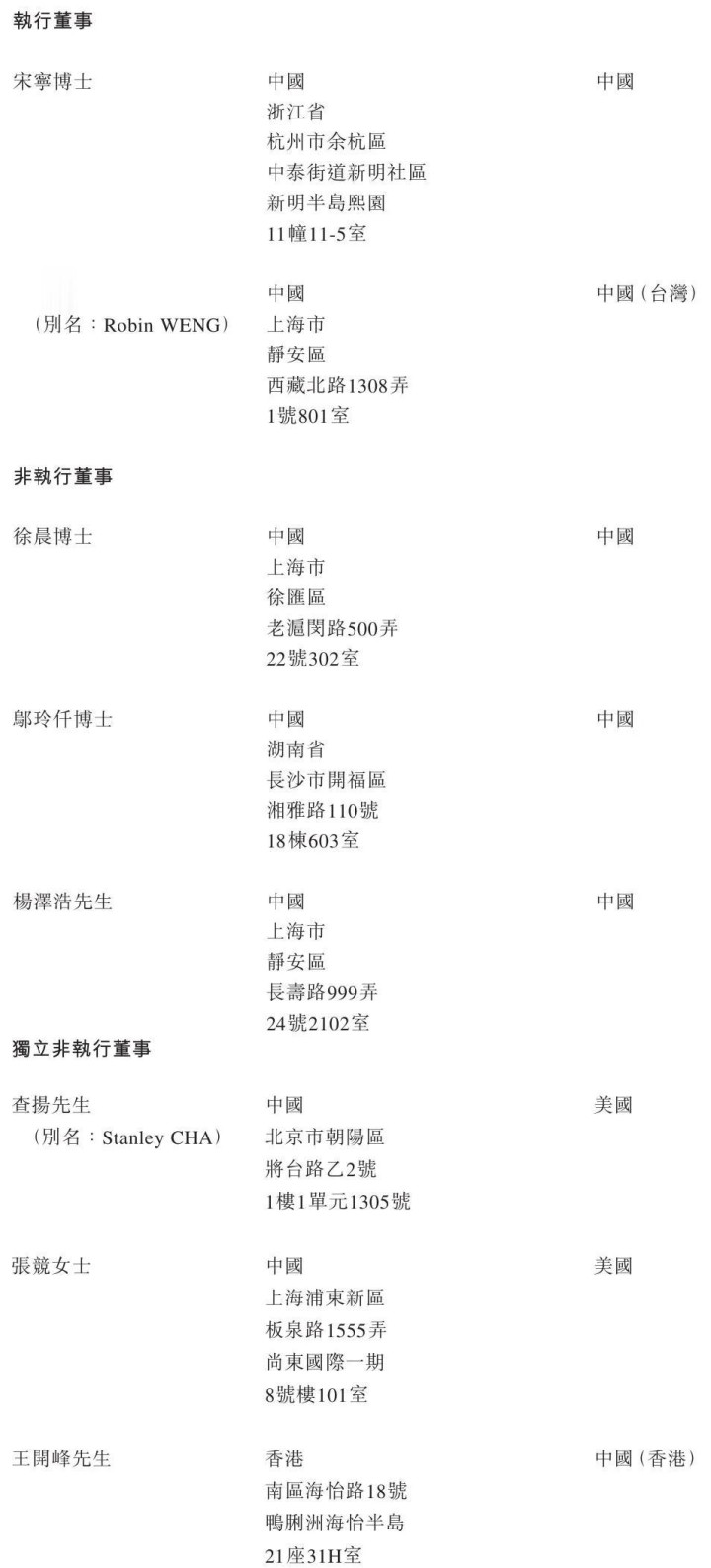 德适生物施行董事分裂为宋宁博士、翁资欣(笔名:Robin WENG),非施行董事分裂为徐晨博士、邬玲仟博士、杨泽浩;寂寞非施行董事分裂为查扬(笔名:Stanley CHA)、张竞女士、王开峰。