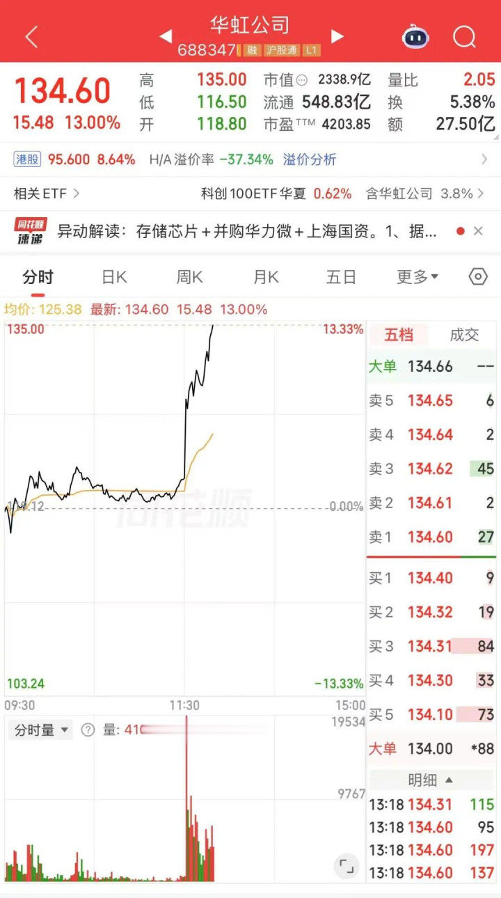 华虹公司(688347)午后直线拉升,达成发稿涨13%,6686体育(6686Sports)最新市值2338.9亿元。