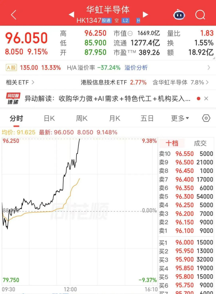 港股方面,华虹半导体相同大涨,达成发稿涨超9%,报96.05港元/股。