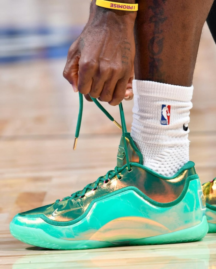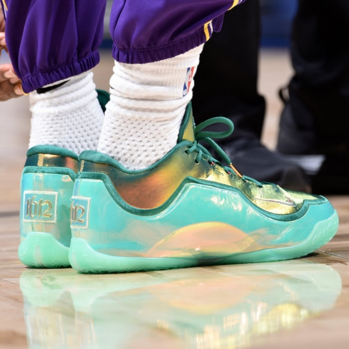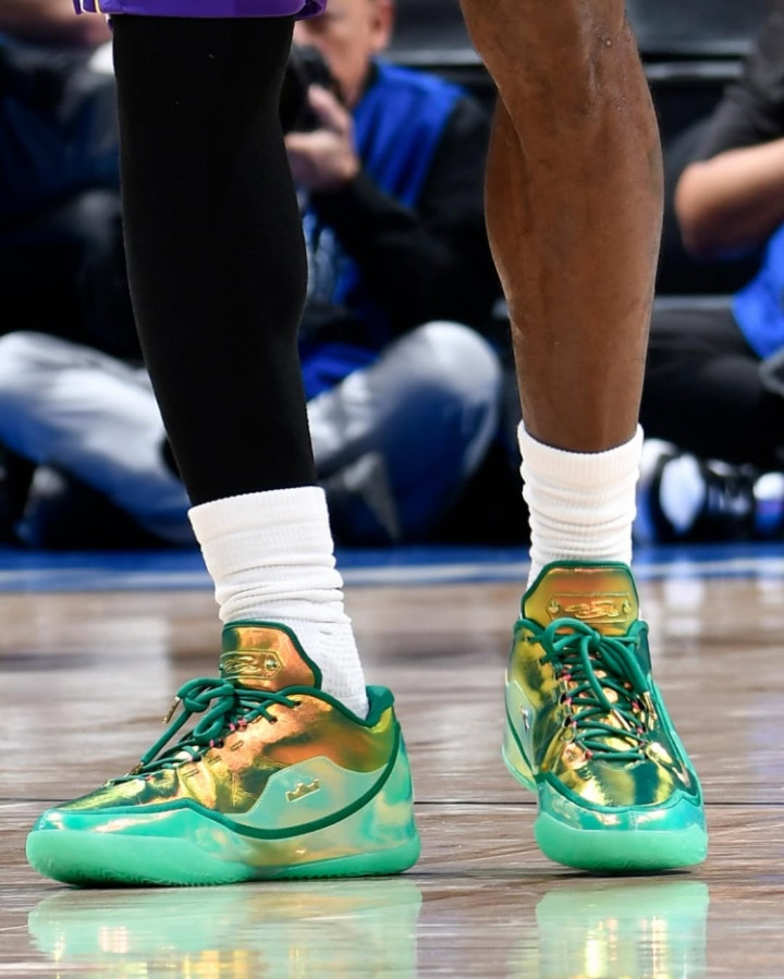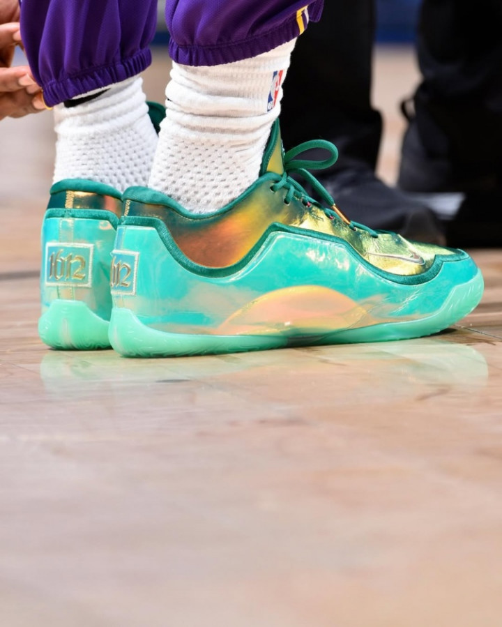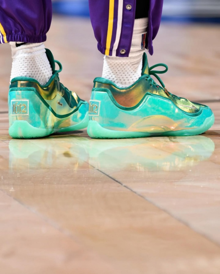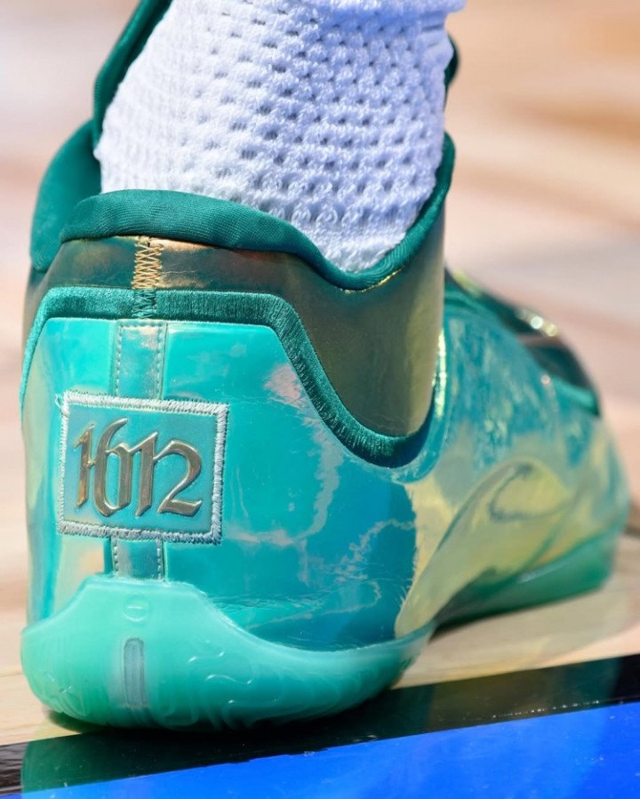 詹姆斯在昨日的比赛中上脚一款终点定制的LeBron23代战靴,球鞋的后跟上附有“1612”的操心字样。