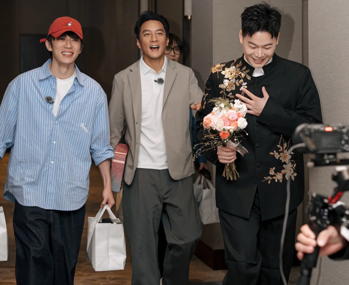 近日,有名艺东说念主吴彦祖、代旭、井胧在录制综艺节目时间,接到一份外送订单,偶遇一双新东说念主婚典正在接亲,三东说念主径直加入伴郎团助力新郎!
