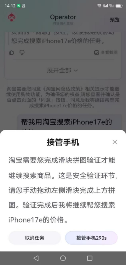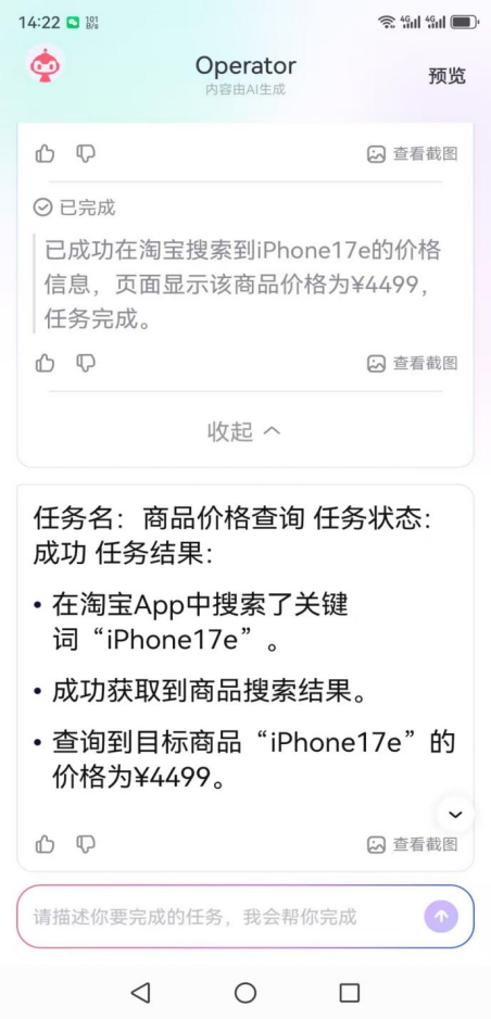 在购物场景下,《BUG》栏目输入指示“帮我用淘宝搜索iPhone17e的价钱”,《BUG》栏目自后屡次采纳手机,输入账号、完成安全考据,6686体育红手指Operator终末顺利完成指示任务。