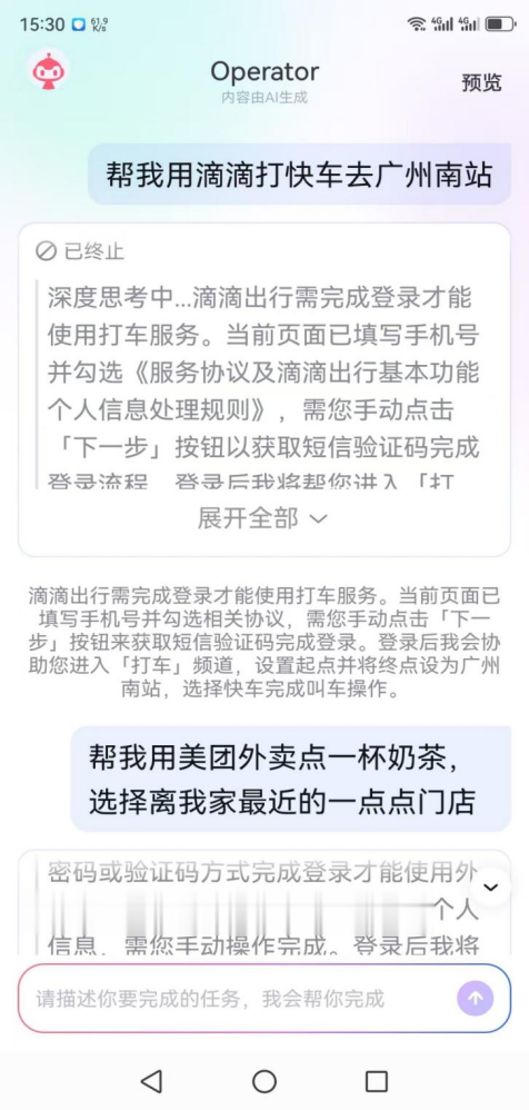 为测试红手指Operator的指示清爽才略、操作清爽度以及任务完成度,《BUG》栏目选取了官方说起的出行、外卖、购物三个高频场景,分辨发起计划指示。