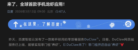 事实上,2月中旬,百度App就已经隆重维持一键调用OpenClaw。3月11日,百度智能云发布了即开即用的零部署工作DuClaw。现在,DuClaw网页端工作已上线,能够杀青零门槛“养虾”;