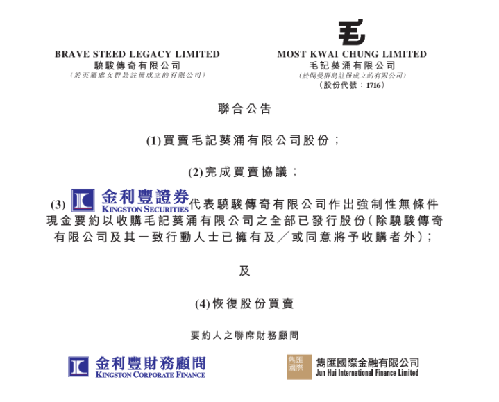 说明公告,毛记葵涌首创东说念主兼主席姚家豪(阿BU)及陆家俊(艺名陈强)以每股0.6963港元作价,出售65%毛记葵涌股份予马黎阳,总作价1.222亿港元,往来已于昨日(3月12日)完成。